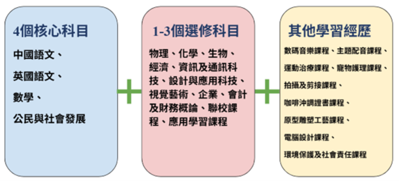 本校學生除了修讀四個必修科目(中國語文、英國語文、數學及公民與社會發展)外,亦修讀數個選修科目,其中包括新高中科目或應用學習課程。此外,校方會為學生提供多種不同的校本「其他學習經歷」課程,讓他們參與五個範疇的「其他學習經歷」,包括價值觀教育、社會服務、與工作有關的經驗、藝術發展和體育發展。